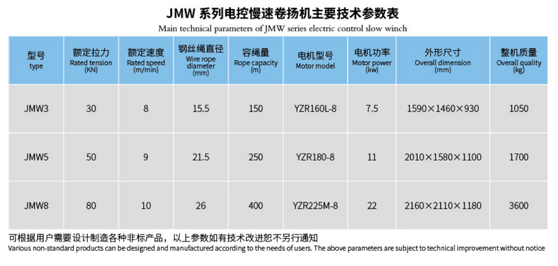JMW系列慢速卷?yè)P(yáng)機(jī)主要用于各種大型、特大型鋼結(jié)構(gòu)及鋼索、鋼纜的長(zhǎng)距離牽引及大型程起吊,其特點(diǎn)鋼絲速度恒定,起吊平穩(wěn)。適用于各種橋梁、港口、碼頭等路橋施工及大型廠礦、電力工程設(shè)備安裝。可以通過(guò)修改用于船上。它以電動(dòng)機(jī)為動(dòng)力,經(jīng)彈性聯(lián)軸節(jié),三級(jí)封閉式齒輪減速箱,牙嵌式聯(lián)軸節(jié)驅(qū)動(dòng)卷筒,采用電磁制動(dòng)。該產(chǎn)品通用性高、結(jié)構(gòu)緊湊、體積小、重量輕、起重大、使用轉(zhuǎn)移方便,被廣泛應(yīng)用于建筑、水利工程、林業(yè)、礦山、碼頭等的物料升降或平拖,還可作現(xiàn)代化電控自動(dòng)作業(yè)線的配套設(shè)備。JM系列為齒輪減速機(jī)傳動(dòng)卷?yè)P(yáng)機(jī)。適用于建筑安裝公司、礦區(qū)、工廠的土木建筑及安裝工程。