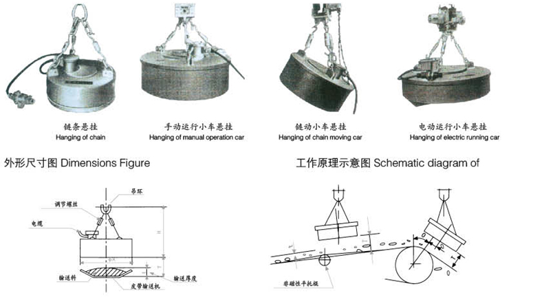 本系列產(chǎn)品是為從磁性礦石中除去有害鐵件而專門設(shè)計的。其工作制為TD=100%.使用時懸掛在皮帶輸送機上,并需配以電動小車,金屬探測器,PC程控整流控制設(shè)備。經(jīng)吸引、分選、除鐵、回收等程序?qū)崿F(xiàn)自動,并安全地從輸送的磁性礦石中除去有害鐵件,同時將被吸的礦石自動送回皮帶輸送機上得到回收。