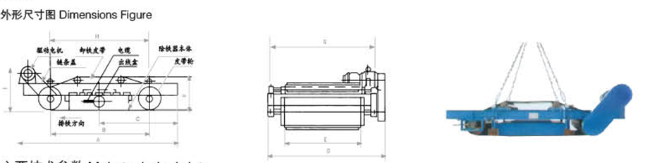 | 產(chǎn)品型號 | 對應(yīng)行標(biāo)型號 | 標(biāo)準(zhǔn)架設(shè)高度(mm) | 輸送皮帶寬度 (mm) | 額定電壓(V) | 冷態(tài)消耗功率(KW) | 自重(kg) | 外形尺寸(mm) | 卸扣 | 驅(qū)動電機容量 | 配套電控(單臺除鐵器用) | ||||||||
